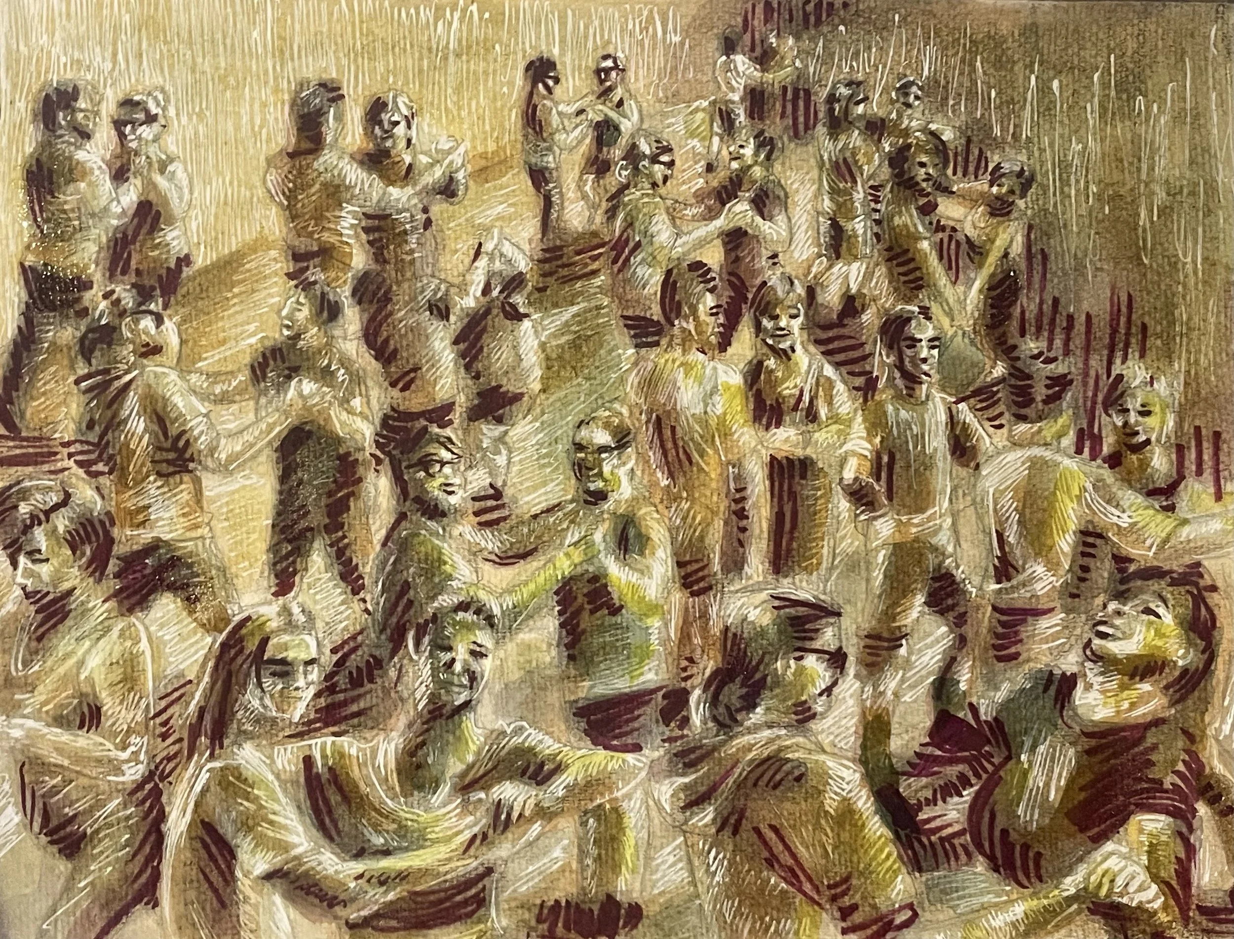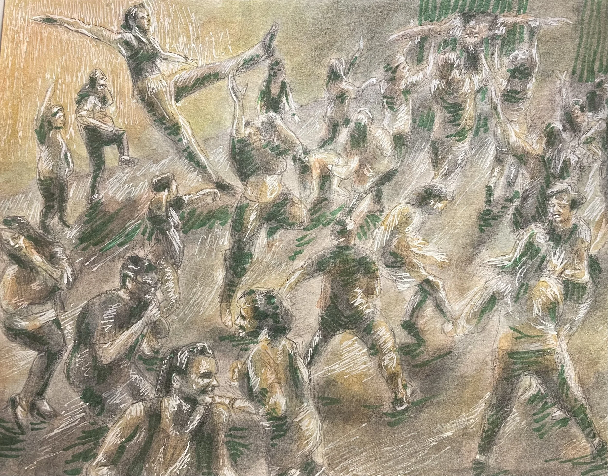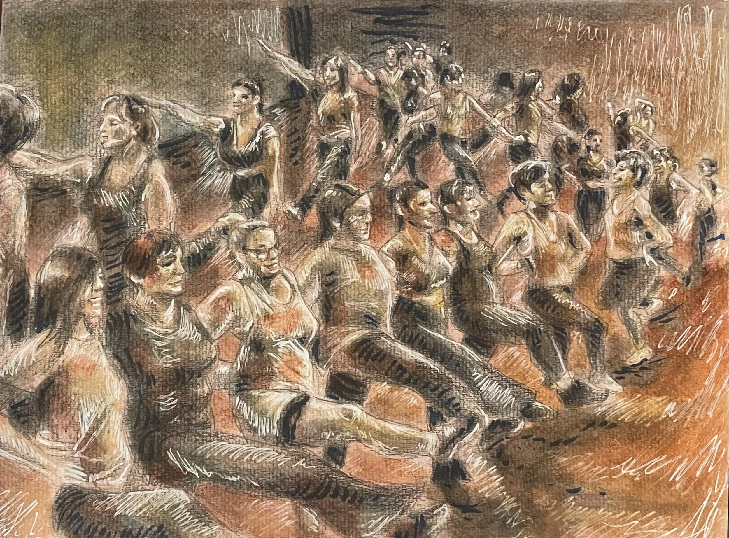 Kickline (2023) 11"x8 1/2" graphite, watercolor, and ink on watercolor paper.